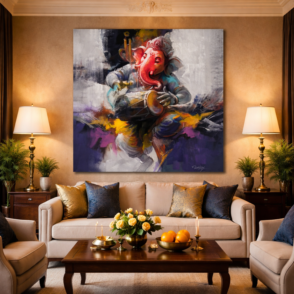 About Ganesha Canvas Painting Playing Mrudanga Lord Ganesha in his most jubilant, liberating form Nritya Ganapati, the dancing Ganesha lost in the divine rhythm of the mrudanga (the ancient Indian barrel drum) he cradles and plays with both hands. His head is tilted back, his mouth open in blissful abandon, his eyes shut in the kind of total immersion that only pure devotion and pure joy can produce together. This is Ganesha as the cosmic musician, the remover of obstacles through the transformative power of sound, rhythm, and celebration. In Hindu tradition, music and dance are among the highest forms of worship — and here, Ganapati himself embodies that truth. This canvas painting does not merely depict a deity; it transmits an energy — one of unstoppable joy, creative abundance, and divine momentum. Style & Technique This Ganesha Canvas Painting Playing Mrudanga is a masterwork of contemporary Indian expressionism. The figure of Ganesha is rendered with remarkable realism and sculptural precision — his coral-red form, pearl necklace, ornate mukut (crown), and dhoti are executed with confident, detailed brushwork — while the surrounding background dissolves into gestural abstraction, with palette-knife-applied textures of silver-grey, explosive yellow, deep purple, navy, and burnt sienna swirling outward like the energy of his dance made visible. This contrast between realistic figure and abstract ground creates a dramatic visual tension that is arrestingly modern and deeply spiritual at once. Color Palette The painting is anchored by Ganesha’s vivid coral-red and vermillion complexion — a bold, auspicious hue that immediately commands attention and carries the symbolic energy of Shakti and celebration. Against the cool silver-grey and white of the textured background, this red becomes luminous. Explosive bursts of golden-yellow, deep purple, navy blue, teal, and burnt sienna radiate outward like fireworks of divine rhythm, giving the canvas a festive, jubilant energy. This palette is exceptionally striking in Indian homes against white, grey, or charcoal-toned walls, and equally powerful against warm cream or beige interiors. Composition & Visual Flow The composition is square in format, with Ganesha occupying the powerful central position — the eye is drawn immediately to his vivid coral face, thrown back in bliss, before flowing downward along his arms to the mrudanga, and then outward into the swirling abstract energy that surrounds him. A glimpse of a trishul or musical instrument appears in the upper-left, adding a sacred symbolic note. The dynamic diagonal thrust of Ganesha’s posture — leaning back, body in motion — creates a strong sense of rhythm and movement, as though the painting itself is keeping beat. Mood & Atmosphere The mood of this Ganesha Canvas Painting Playing Mrudanga is unambiguously one of pure, contagious joy — Ananda in its most exuberant form. It is celebratory, energising, and life-affirming. In a home, this canvas does not create quiet calm; it creates uplift — a rush of positive energy every time you enter the room. For devotees, it is an expression of Ganapati’s most beloved quality: his ability to transform obstacles into celebrations, and silence into music. This is the painting you choose when you want your home to feel alive. Perfect For (Room & Space) Drawing Room / Living Room: The vibrant palette and explosive energy make this an unmissable centrepiece — place it on the main accent wall for maximum visual and spiritual impact. Home Entrance / Foyer: Ganesha at the threshold is the most auspicious Vastu placement; this dancing, joyful form welcomes every guest with divine energy and positivity. Pooja Room / Mandir: A Ganesha painting is always at home in the puja space — this exuberant form is particularly meaningful for those who worship through music, art, and celebration. Children’s Room or Study: The joyful, vibrant energy of dancing Ganesha — the deity of wisdom and new beginnings — is deeply inspiring for young learners and creative minds. Home Studio or Creative Workspace: Ganesha is the patron deity of arts, letters, and creativity; this painting is a natural muse for artists, musicians, writers, and entrepreneurs. Vastu Significance Lord Ganesha is the supreme Vastu deity — the first to be worshipped, the guardian of all thresholds, and the remover of every obstacle. A Ganesha painting is considered among the most powerfully auspicious artworks in any Indian home. Per Vastu Shastra, a Dancing or Nritya Ganesha painting is best placed near the main entrance or on the North-East (Ishan Kona) wall, where it blesses all who enter and fills the home with creative, prosperous energy. It is also highly auspicious on the East wall of the living room or pooja room. Avoid placing Ganesha paintings in the bedroom or bathroom. The vibrant, upward-moving energy of this particular canvas makes it especially suited to spaces where creativity, abundance, and positivity are most desired. Gifting Occasions This Ganesha Canvas Painting Playing Mrudanga is among the most joyful and universally beloved gifts in Indian culture, perfectly suited for: Ganesh Chaturthi, Diwali, Griha Pravesh (housewarming), New Business Launch / Inauguration (Muhurat), Wedding, Birthday, Corporate Diwali Gifting, New Year gifting, and any auspicious beginning. Because Ganesha is worshipped before every new endeavour in Hindu tradition, this painting is a deeply meaningful and universally appropriate gift across all occasions. Product Specifications Medium: Acrylic on Canvas Artist: Sampadaa Mahalley Canvas: Premium stretched cotton canvas, ready to hang Sizes Available: 15×15 in · 24×24 in · 30×30 in (square format ) Frame Options: Unframed / Framed Free delivery across India Aratce Studio’s Ganesha Canvas Painting Playing Mrudanga is a contemporary Indian expressionist artwork depicting Lord Ganesha in his Nritya Ganapati form — playi