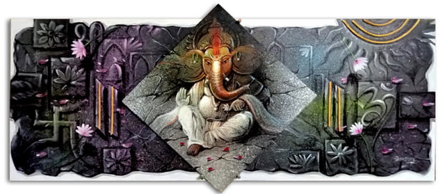 Spirituality, Indian mythology, and symbolism are central themes in the painting, with Lord Ganesha being a symbol of wisdom, prosperity, and new beginnings.